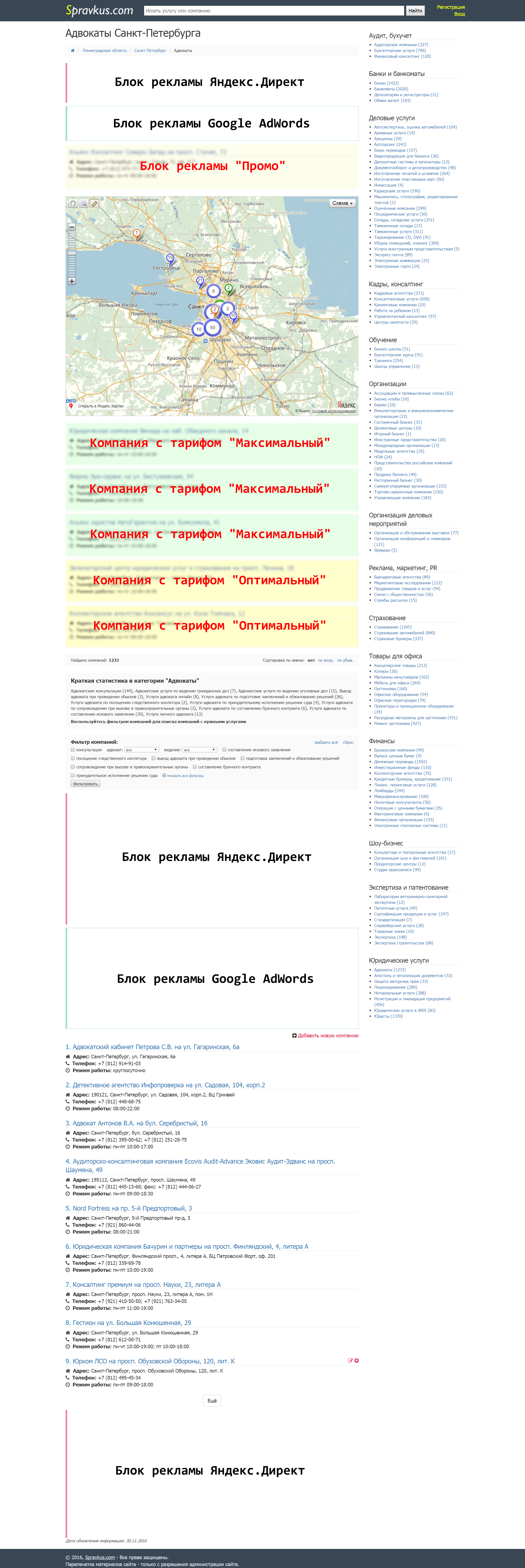 На странице категории сначала показывается компания с услугой Промо, потом карта города с компаниями на ней, а затем уже список компаний с тарифами Максимальный и Оптимальный